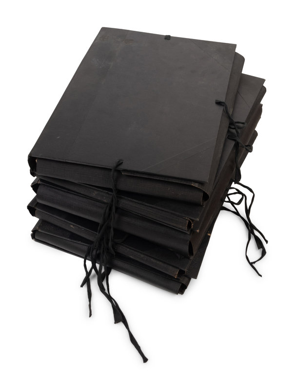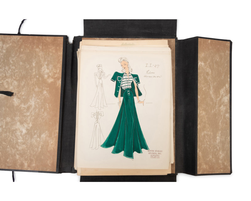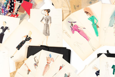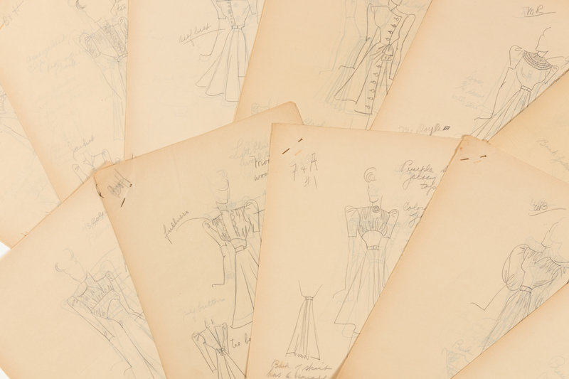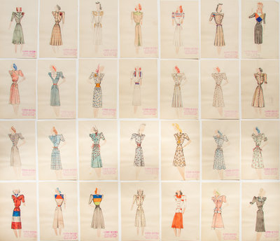 Various 1930's-1940's fashion illustrations, line sheets, designer notes, and sketches maintained in five black hard case loose-leaf folders.