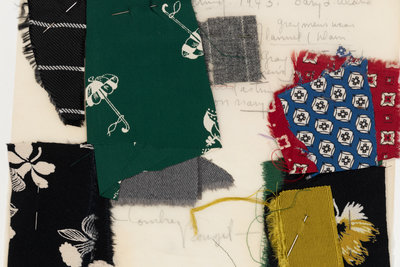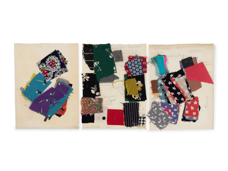 Various designer sketches with notes and fabric swatches, and line sheets.