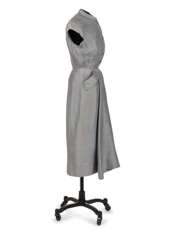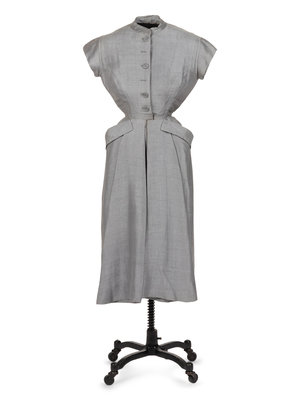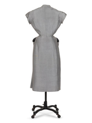 Grey silk cap sleeved dress with front hip pockets, two panels which lay over the skirt, and center front button closure.