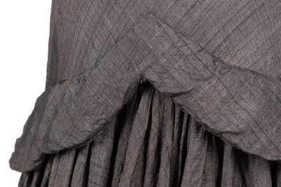 Dark gray raw silk drop waist dress with short shawl collar neckline, drop shoulder cap sleeves, full skirt, and left side zipper closure.