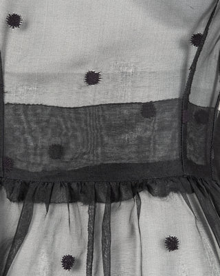 Black organza embroidered with polka dots bouffant dress with scoop neckline, gathered full skirt, and left side zipper closure.