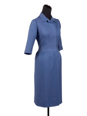 Blue silk blend day dress with half length sleeves, rolled pointed collar, gathered straight-fit skirt, and front hidden hook and eye closures.