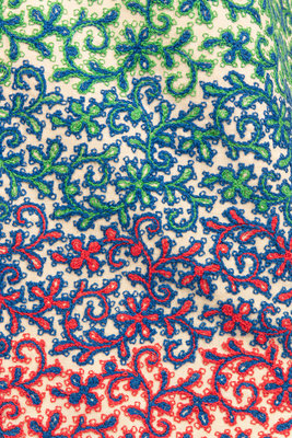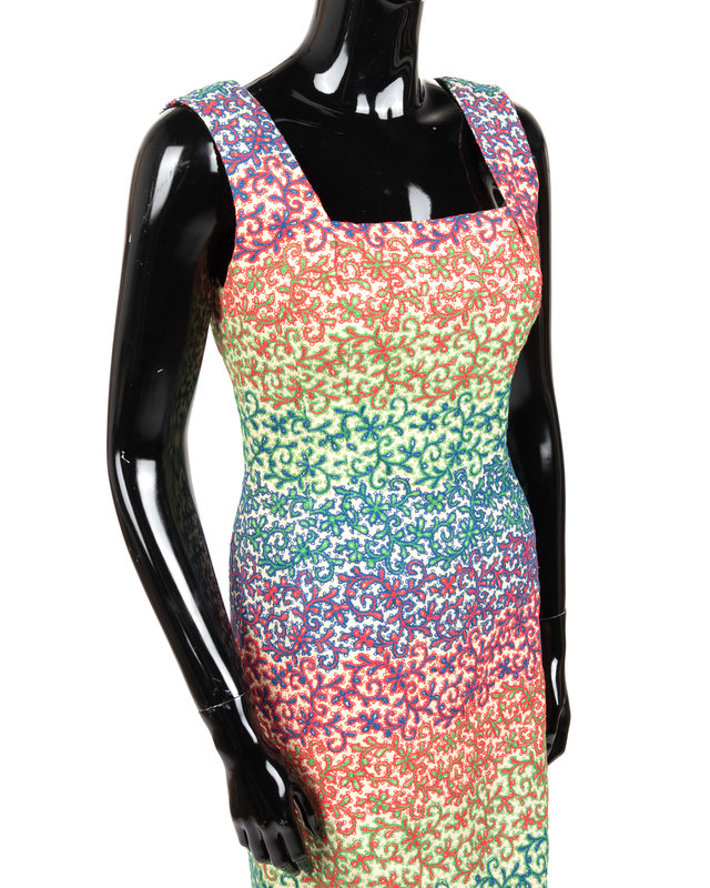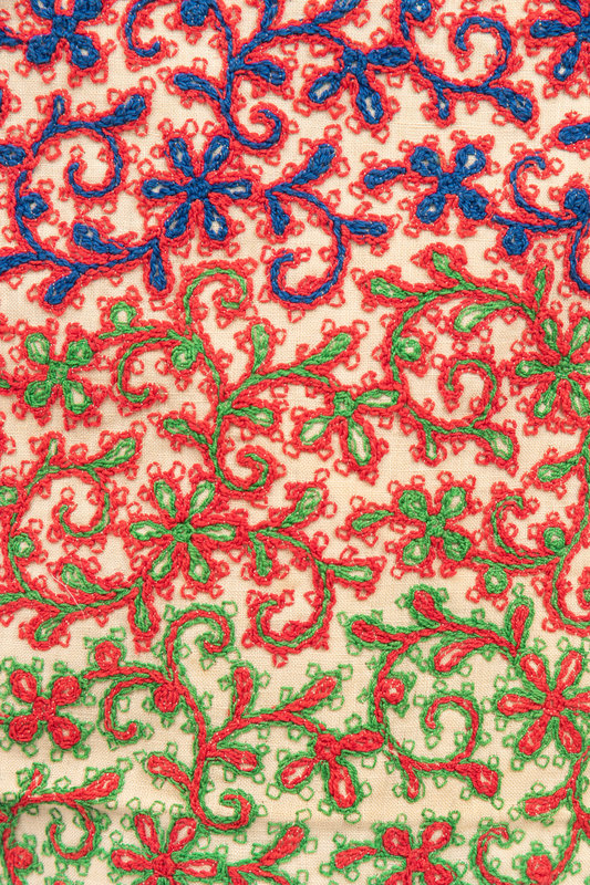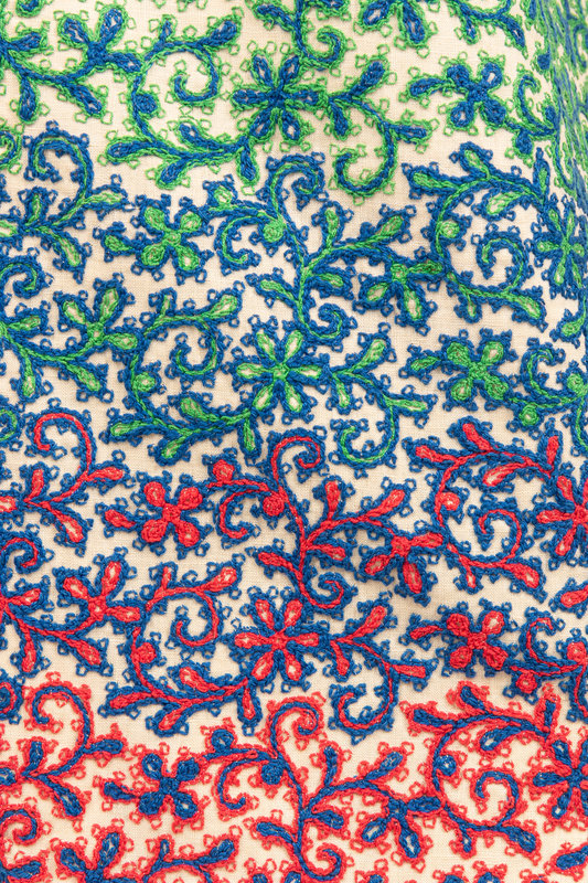 Cream linen sheath dress embroidered in red, green, and blue cotton thread floral motif, box and back V-neckline, back skirt pleat, and center back zipper closure.