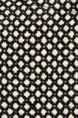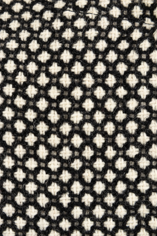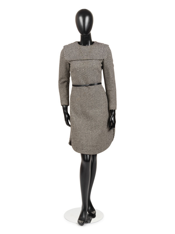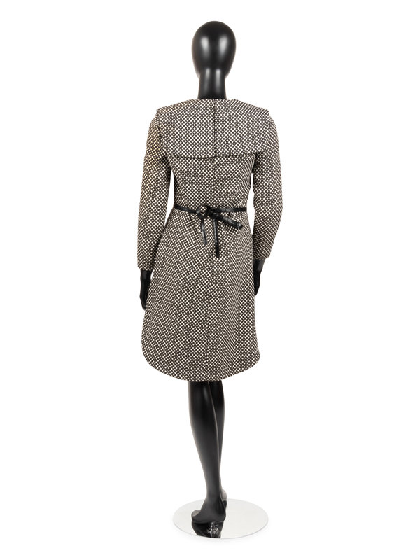 Black and white wool dress with crew neckline, sailor collar, long sleeves and a two-layered skirt. The overlay of the skirt is cut with a curved hem and is open at the side seams to the high hip, revealing a straight skirt underneath of the same material. Center back zip. Comes with a black belt of synthetic material.