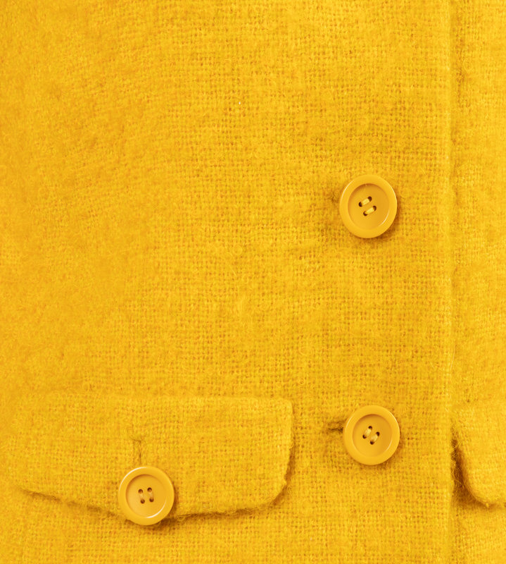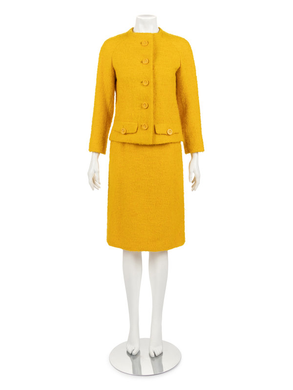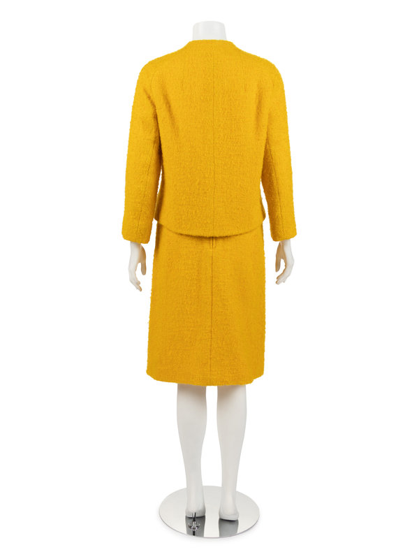 Yellow wool loose boucle two-piece skirt suit with funneled neckline jacket with raglan sleeves, front waistline flap faux pockets, and center front button closures; paired with matching A-line skirt with center back zipper closure.