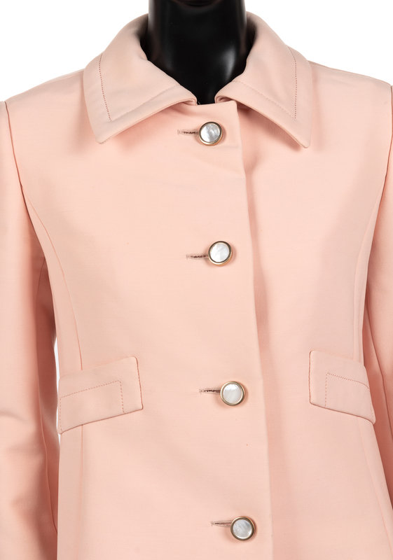 Pale pink A-line coat with pointed rolled collar, front waist faux pocket welts, and center front shell buttons set in gold-tone metal; paired with peach pink sleeveless shift dress with center back zipper closure.