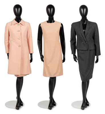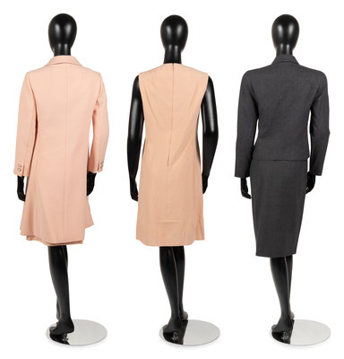 This lot include two ensembles; one two-piece skirt suit, one dress and matching coat.