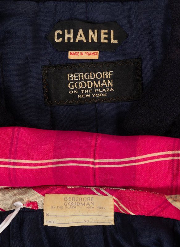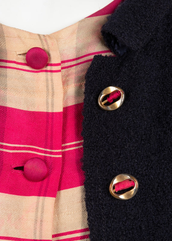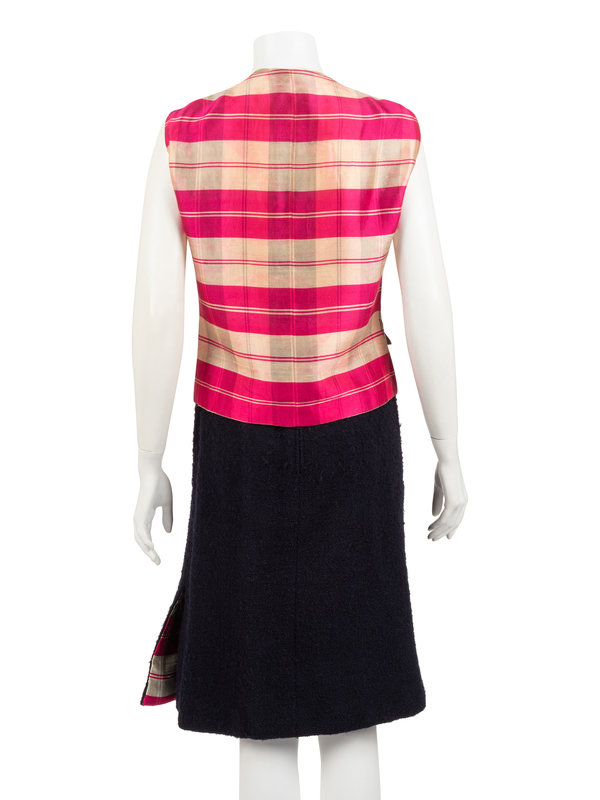 Navy blue wool boucle three-piece skirt suit including a cardigan style quilted jacket with rolled collar, pink and cream silk plaid cuffs, and gold-tone button closure; paired with matching flared navy wool boucle skirt and pink and cream silk plaid sleeveless shell with front patch pockets and center front button closure. Interior Bergdorf Goodman label reads date as "3/19/64".