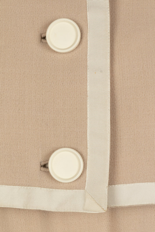 Beige wool dress ensemble including a cropped jacket with front button closure; paired with a matching dress trimmed with cream grosgrain ribbon.