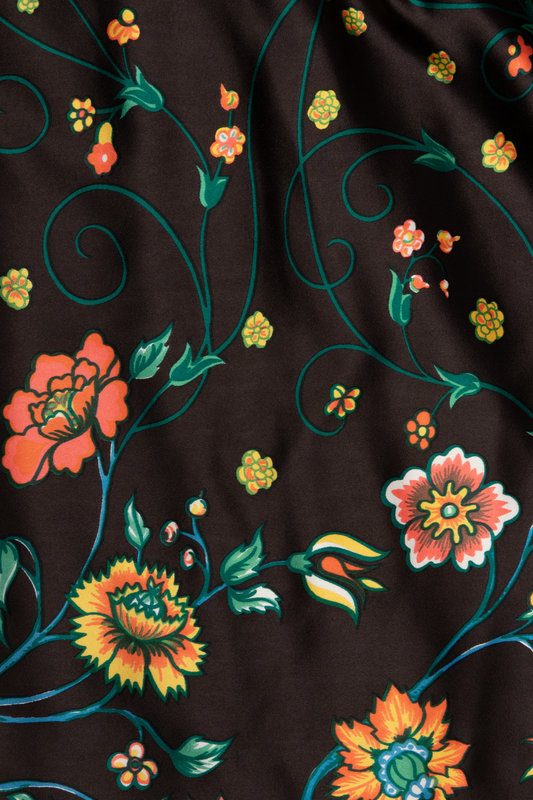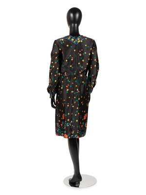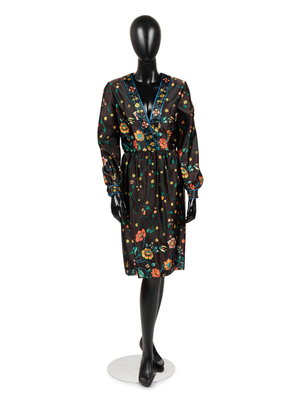 Black silk dress printed with a multicolored floral pattern and a plunging v-neckline, long gathered sleeves and a center back zipper. There are belt loops but no belt.