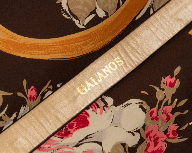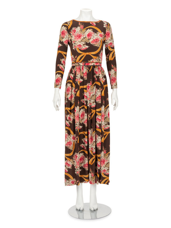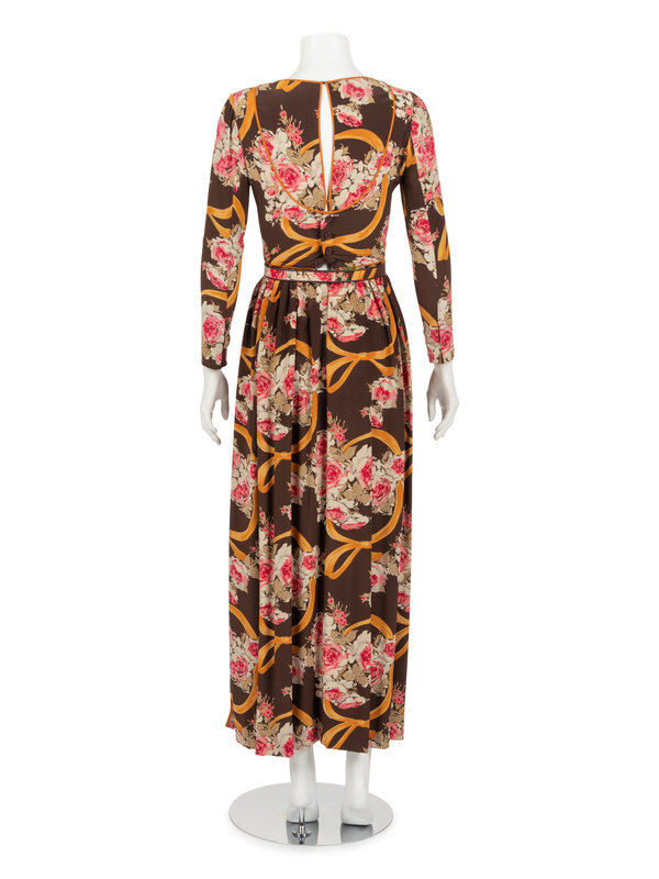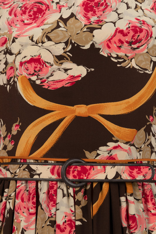 Brown silk dress with floral print and matching belt. The all-over floral print is made of bunches of roses and gold ribbon. The dress is beautifully made with most edges finished in orange silk and an underlayer of brown silk throughout the bodice and skirt. The dress closes down the center back with hook and eyes, buttons and a zip. The skirt has deep slits on each side seam. The belt is made of the same material as the dress and is edged in brown leather.