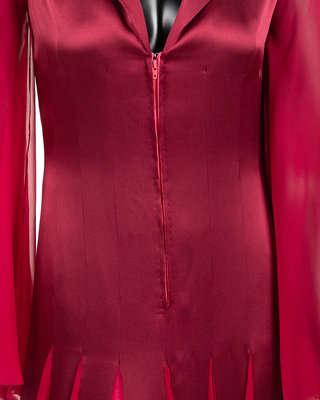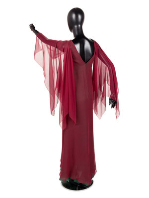 Burgundy silk satin collared evening dress with wine colored silk chiffon bell sleeves and skirt godets, lined in bright pink chiffon, and center front zipper closure.