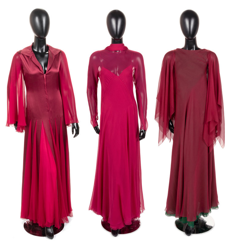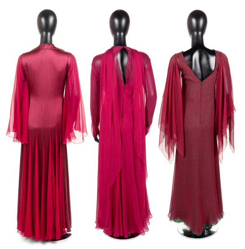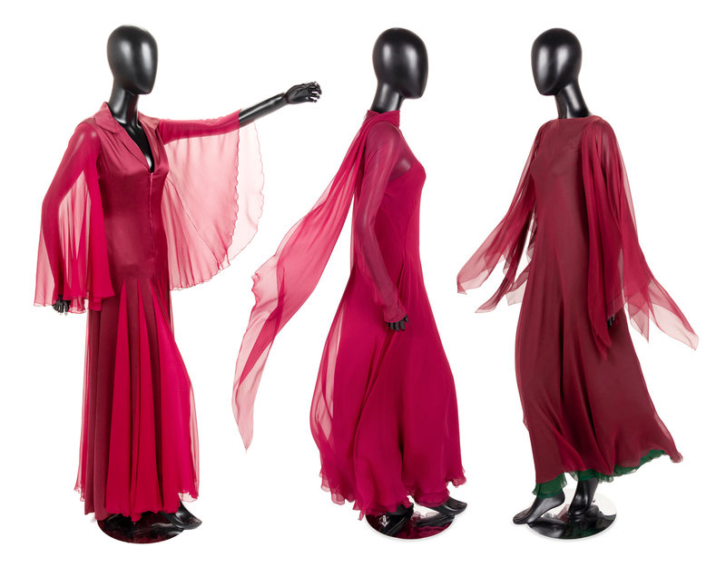 This lot includes three dresses. Greek antiquity provided for the foundation for George Stavropoulos’ 1970s glamour in diaphanous drapery and swirling chiffon. Based in Athens and New York, his fashions attracted the attention of prominent American women including Maria Callas, Elizabeth Taylor, and Lady Bird Johnson.