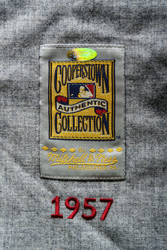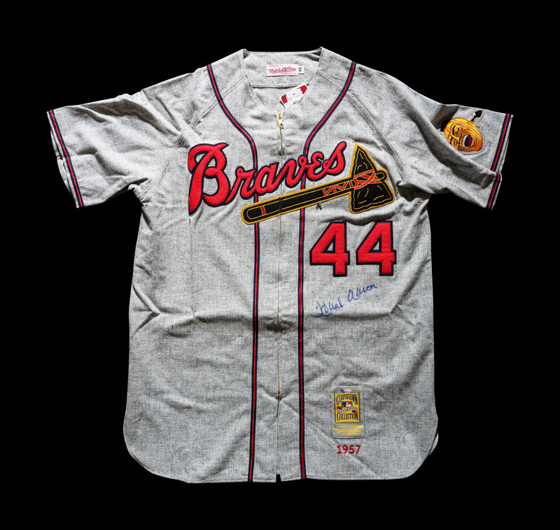 A Hank Aaron Signed 1957 Milwaukee Braves Mitchell & Ness Cooperston Collection Baseball Jersey (Steiner),