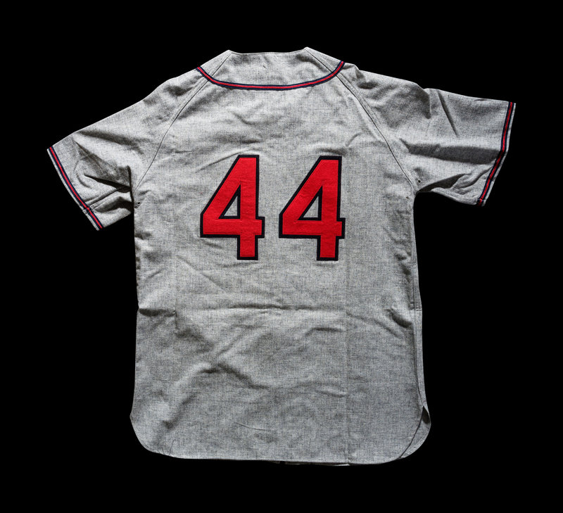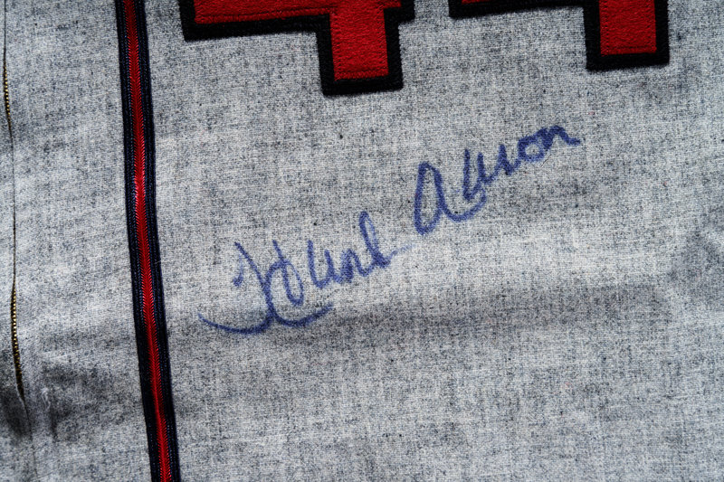inscribed ("Hank Aaron") in blue Sharpie on front beneath number 44.
