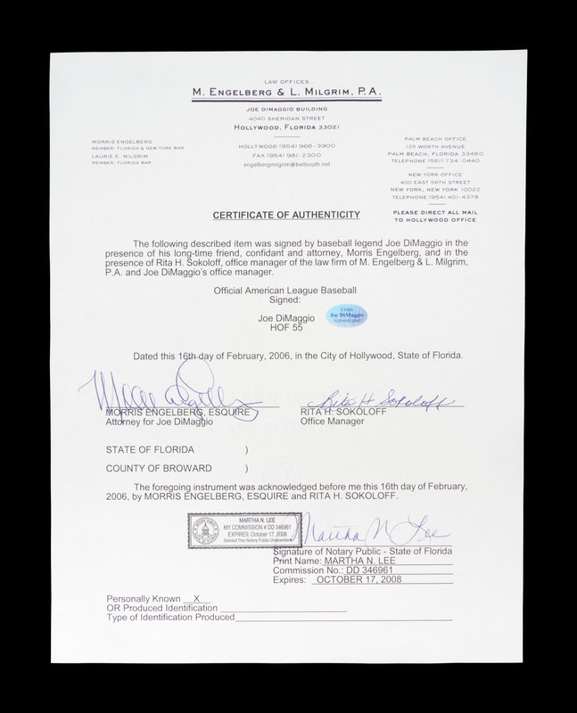 A Joe DiMaggio Signed and Inscribed HOF 55 Official American League Baseball