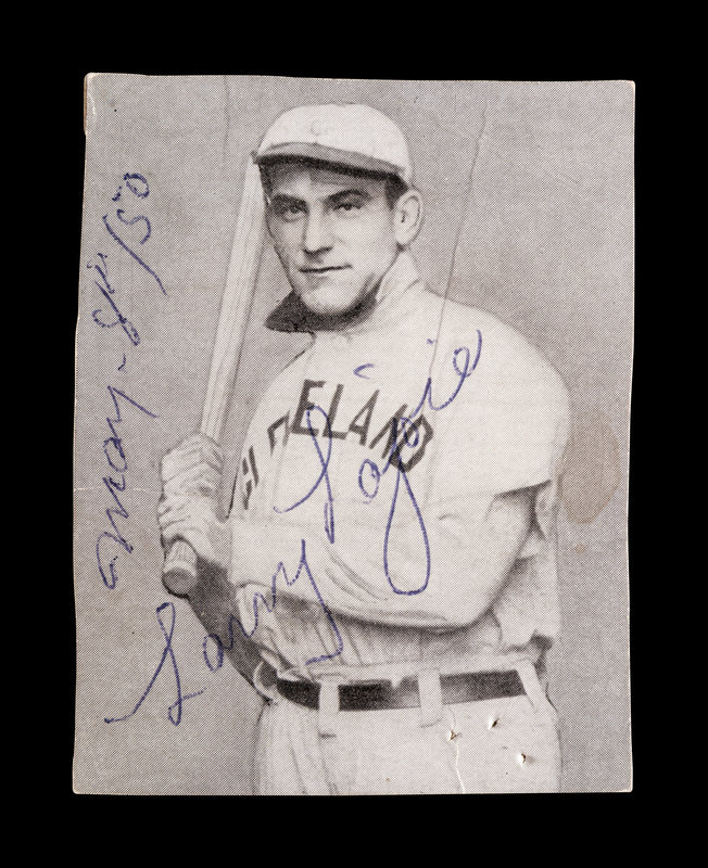 Inscribed "Larry Lajoie, May - 8th / 50" in blue ink on batting pose photograph of Lajoie in Cleveland Naps uniform.