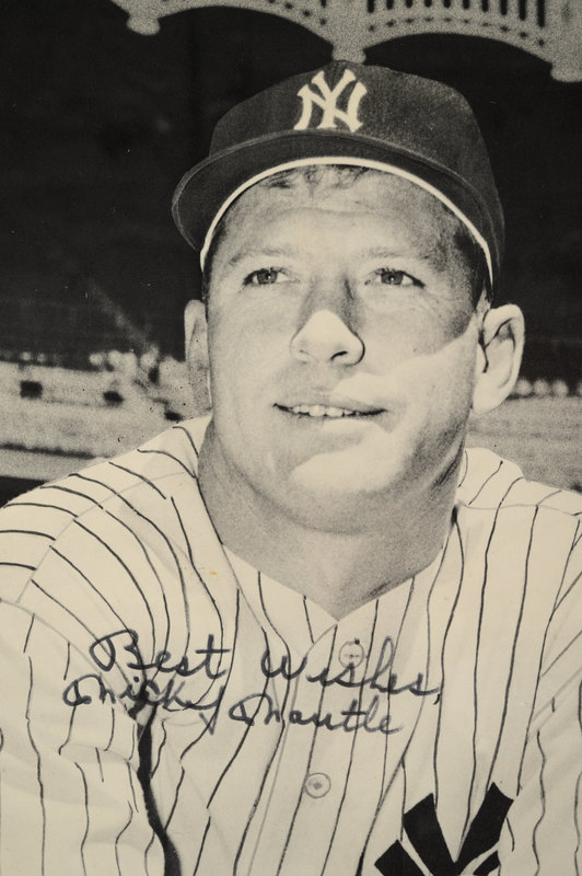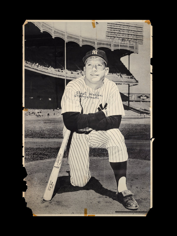Inscribed "Best Wishes, Mickey Mantle" in black marker on 1960s image of Mantle kneeling with bat at Yankees Stadium. Signature inquired directly by consignor as a child from Mantle before game at Yankees Stadium. A rare poster and uncommon in signed form. Wear and paper loss on sides and corners.