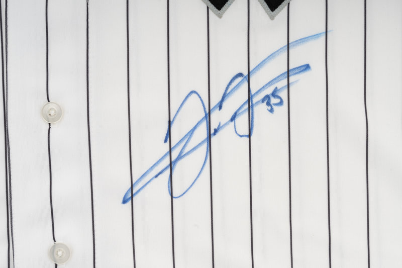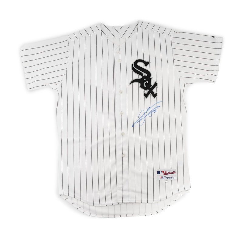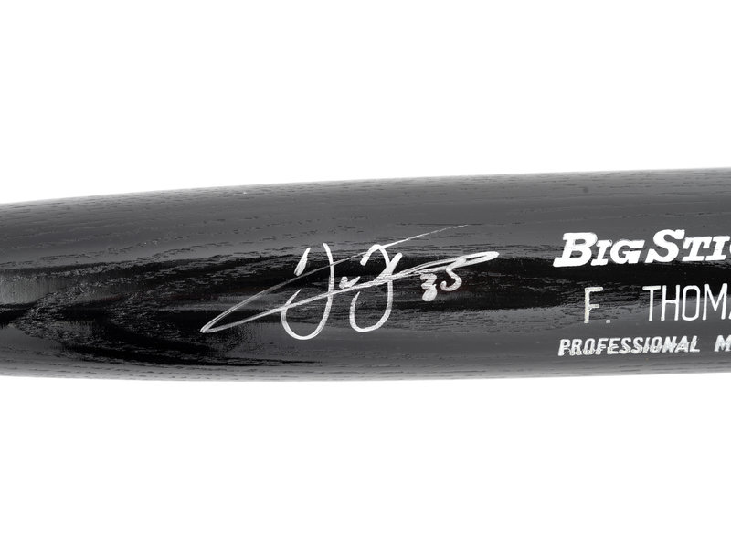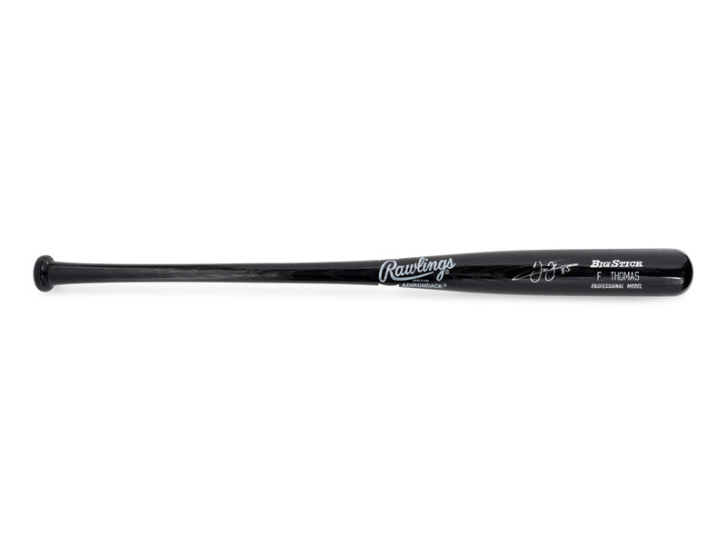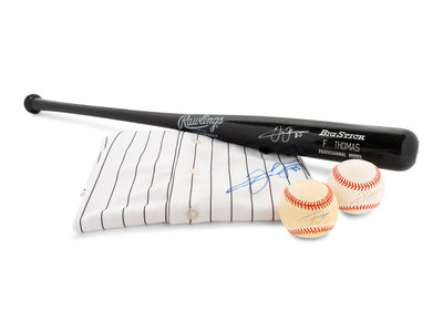 comprising of a Rawlings F. Thomas model baseball bat inscribed "Frank Thomas" 35 in silver ink, two official Rawlings baseballs inscribed "Frank Thomas 35) in ink and an official Majestic Chicago White Sox jersey inscribed "Frank Thomas 35) in blue Sharpie on front underneath Sox logo.