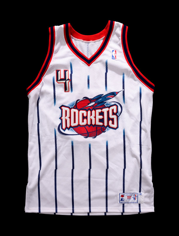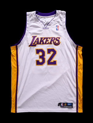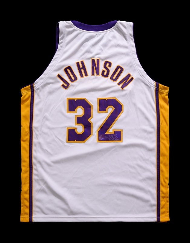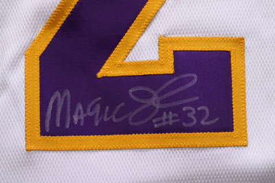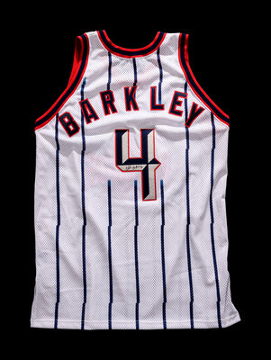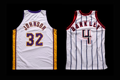 comprising of a Los Angeles Lakers Reebok jersey inscribed "Magic Johnson #32" in silver ink inside number 2 on back of jersey and a Houston Rockets Starter model inscribed "Charles Barkley" in black Sharpie inside number 4 on back of jersey.