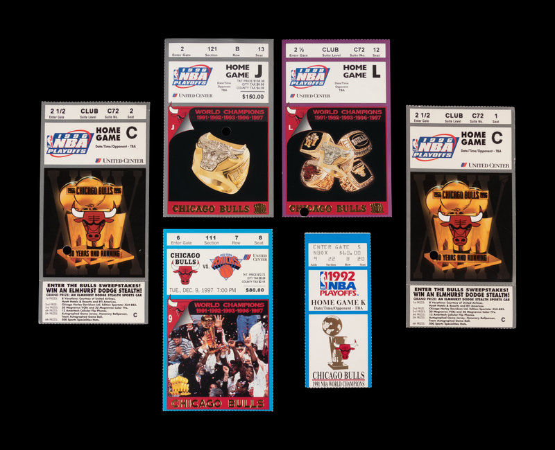 A Group of Six Michael Jordan Chicago Bulls Playoffs and NBA Finals "Last Dance" Era Ticket Stubs including "The Shrug" game from 1992 Finals,