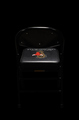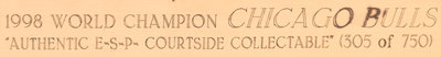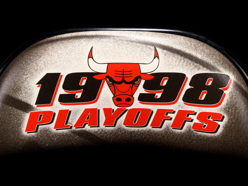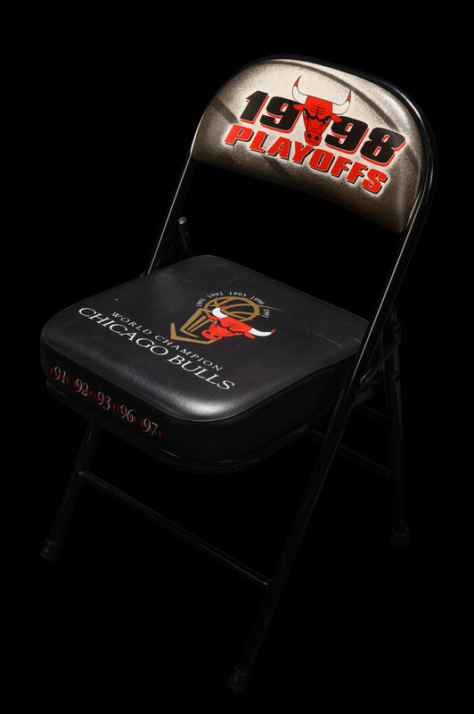 A 1998 folding chair featuring 1998 Playoffs on setback and 91, 92, 93, 96, 97 World Champion Chicago Bulls on cushion (Numbered 305 of 750).