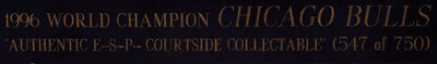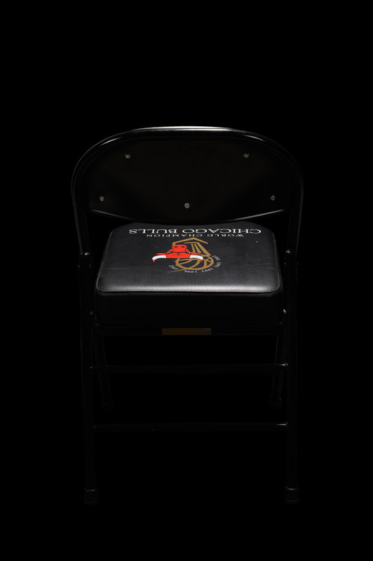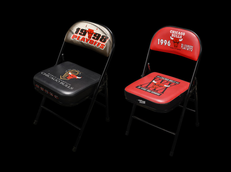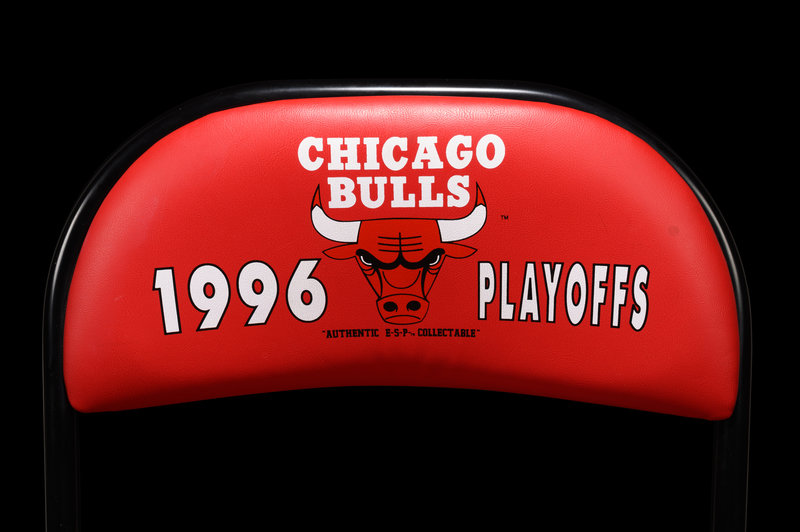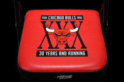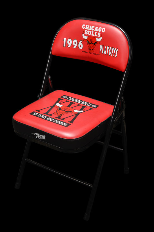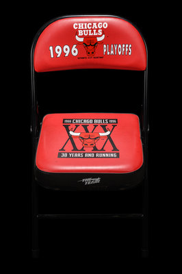 a 1996 folding chair featuring Chicago Bulls 1996 Playoffs on setback and 1966-1996, XXX Chicago Bulls Thirty Years and Counting on cushion (Numbered 547 of 750).