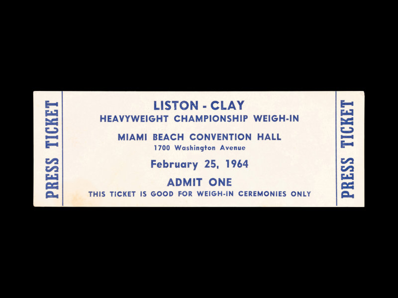 reads PRESS TICKET LISTON-CLAY, HEAVYWEIGHT CHAMPIONSHIP WEIGH-IN, MIAMI BEACH CONVENTION HALL, 1700 Washington Avenue, February 25, 1964 ADMIT ONE, THIS TICKET IS GOOD FOR WEIGH IN CEREMONIES ONLY.
