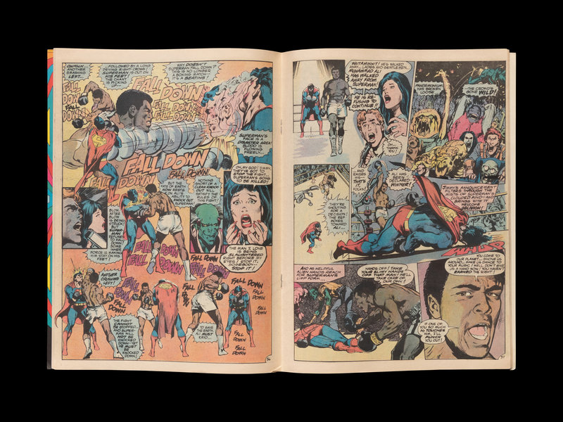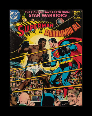 A Group of Five Muhammad Ali On Site Boxing Programs, Press Badge, Ticket and One Superman D.C. Comic Book,