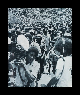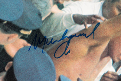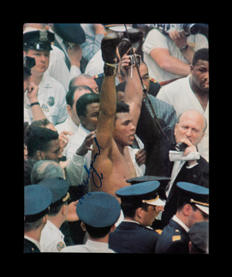 inscribed "Muhammad Ali" in large, bold blue Sharpie on photograph with Ali's hands raised after his 1964 victory over Sonny Liston to capture the world heavyweight championship.
