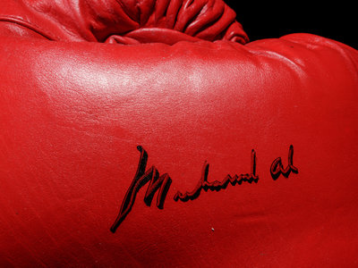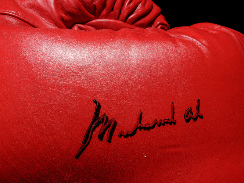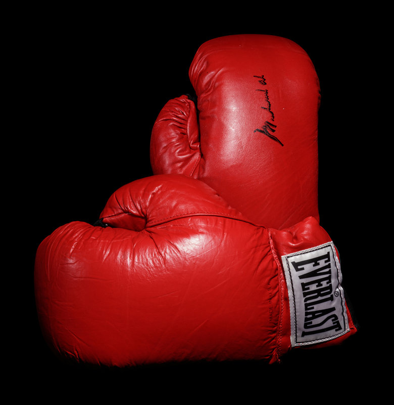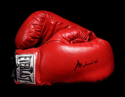 inscribed ("Muhammad Ali") in black Sharpie on right Everlast glove. Housed in display case.