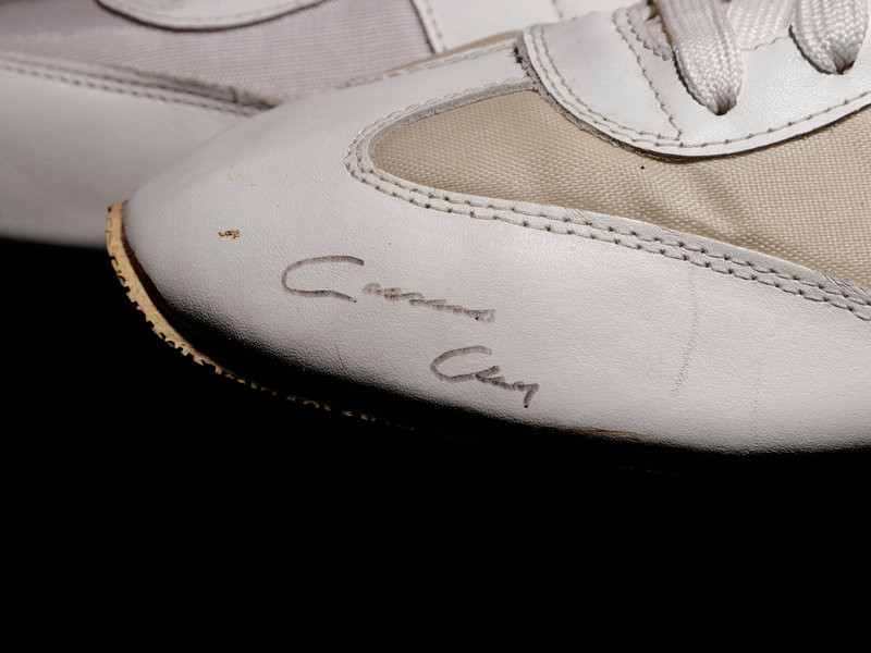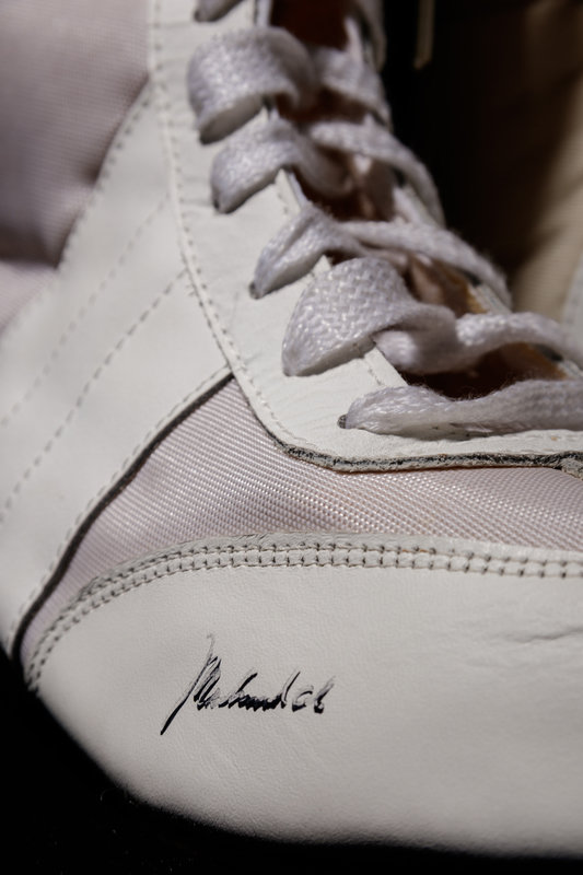 inscribed "Muhammad Ali" in black Sharpie on right shoe and "Cassius Clay" in black Sharpie on left shoe. Size 12 1/2.