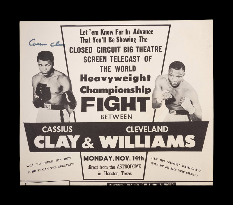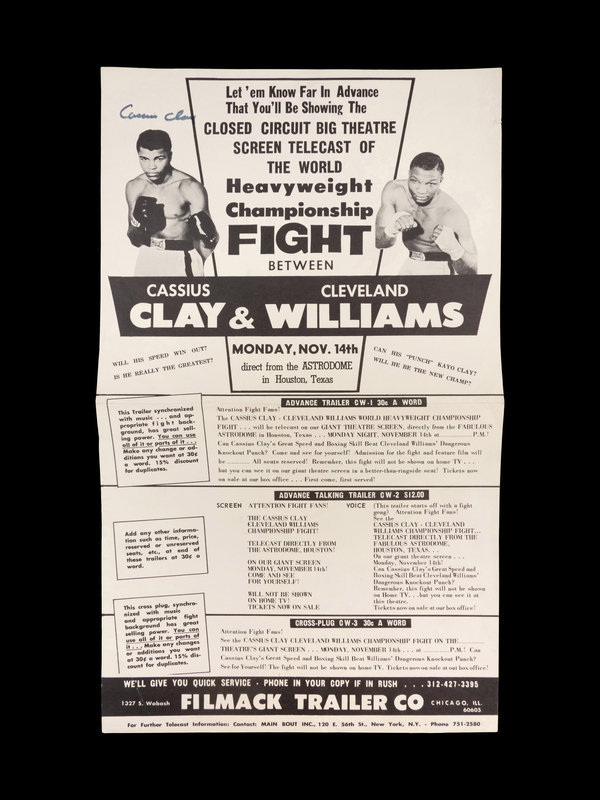 inscribed "Cassius Clay" in blue Sharpie by Ali after his ring career on a 14 1/2 x 8 1/2 sheet marketing the closed circuit broadcast of his November 14, 1966 title defense against Cleveland Big Cat Williams in the Houston Astrodome.