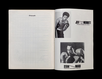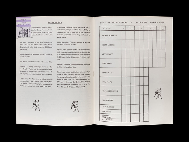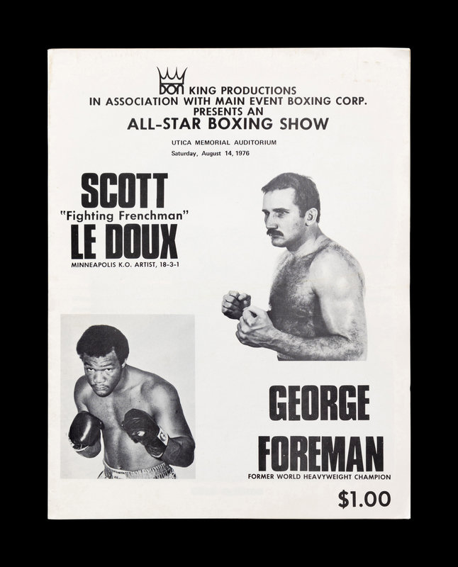 A rare offering from the August 14, 1976 bout between the former heavyweight champion George Foreman and 1970s contender Scott Le Doux at Utica Memorial Stadium. Foreman would win by a third-round knockout in his third fight since losing the title to Muhammad Ali.