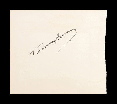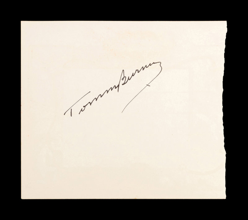 inscribed "Tommy Burns" in black ink on reverse of autograph album page.