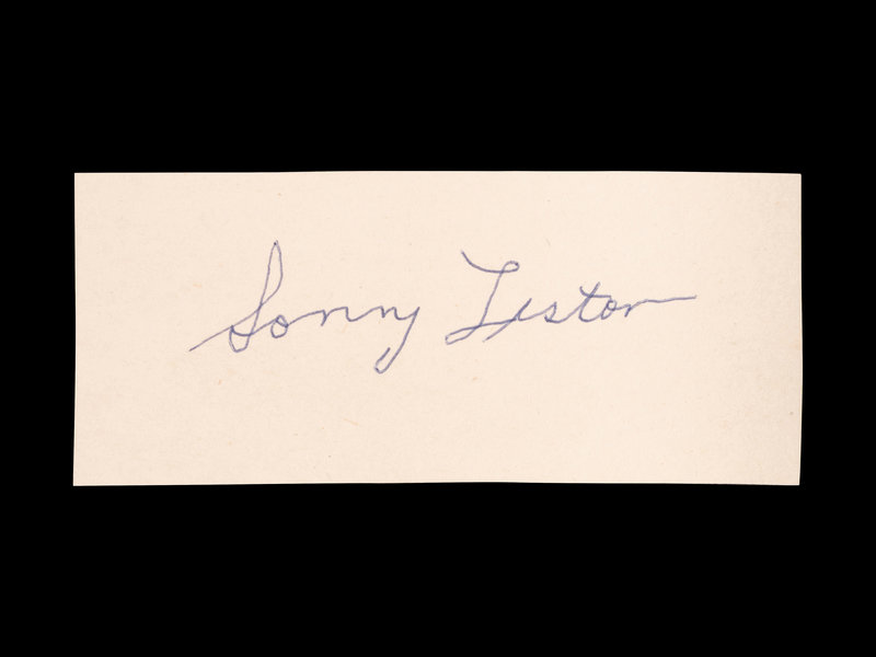 inscribed "Sonny Liston" slowly and deliberately in blue ink on 2 1/4 x 5 1/4. A rare offering from the heavyweight champion who was limited in writing anything more than his name.