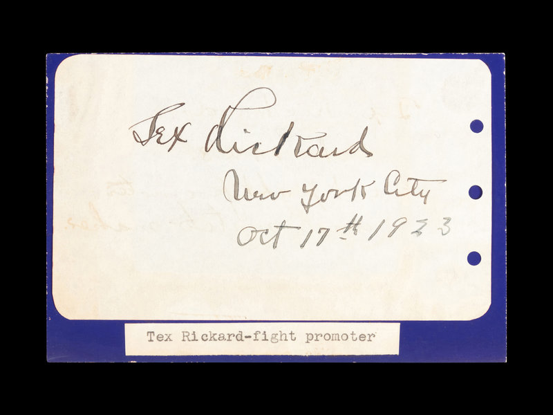 inscribed "Tex Rickard, New York City, Oct. 17th 1923" in ink on scrapbook paper mounted. In 1923 Rickard promoted the first boxing match Yankee Stadium and on September 14 presented the unforgettable Jack Dempsey vs. Luis Angel Firpo at the Polo Grounds. An uncommon signature from the premiere promoter of his time. Signature cut: 3 x 4 3/4 mounted on 3 1/2 x 5.