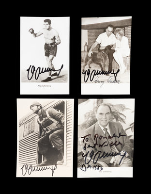 comprising of a 5 1/2 x 3 1/2 fighting pose image inscribed "Max Schmeling" in black Sharpie, a 5 1/2 x 3 1/2 post card of Schmeling with his wife Anne Ondra inscribed "Max Schmeling" and "Anne Ondra" in black Sharpie, a 6 x 4 post card of Schmeling during World War II as a paratrooper with the German Air Force inscribed "Max Schmeling" in black Sharpie and a post card portrait of Schmeling in his later years inscribed "To Robert Best Wishes Max Schmeling 1983."