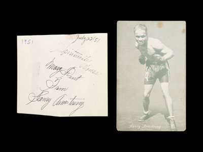 comprising of a paper inscribed "July 22/51 Spiritually Yours Mary Dent From Henry Armstrong" and a index card of Armstrong in a fight pose.