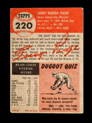A 1953 Topps Satchel (Satchell) Paige Baseball Card No. 220