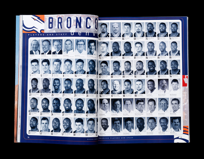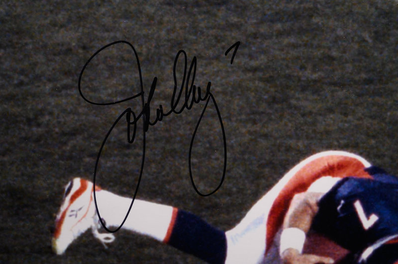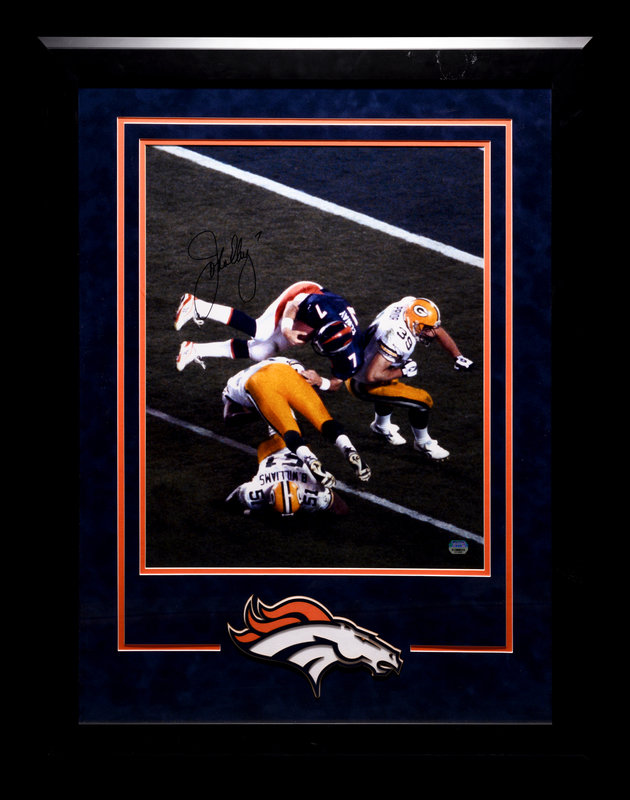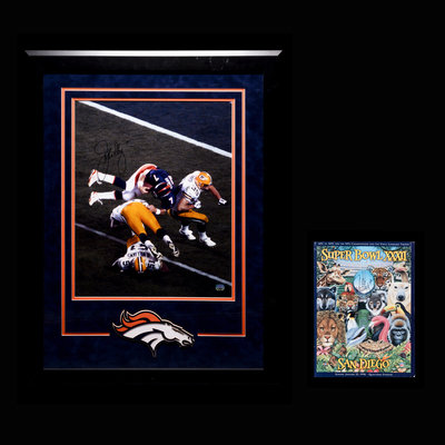 comprising of an official Super Bowl XXXII program inscribed "John Elway 7" in black sharpie and a framed image of Elway's helicopter dive inscribed "John Elway 7" in black sharpie.