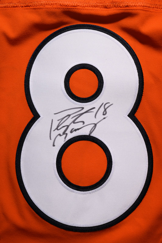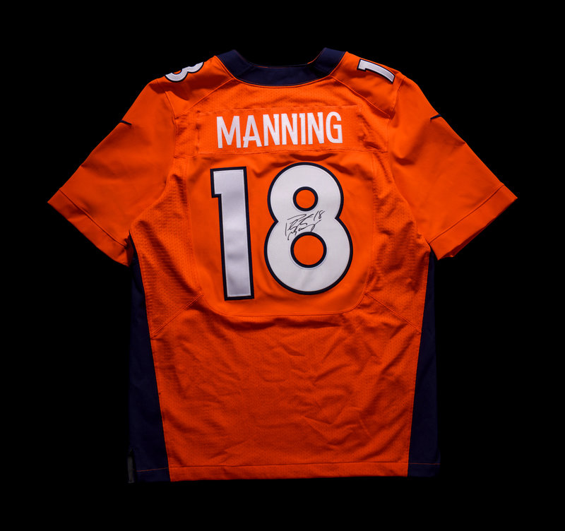 inscribed "Peyton Manning 18" in black Sharpie inside number 8 on back of jersey. Orange home jersey, size 44.