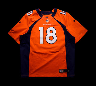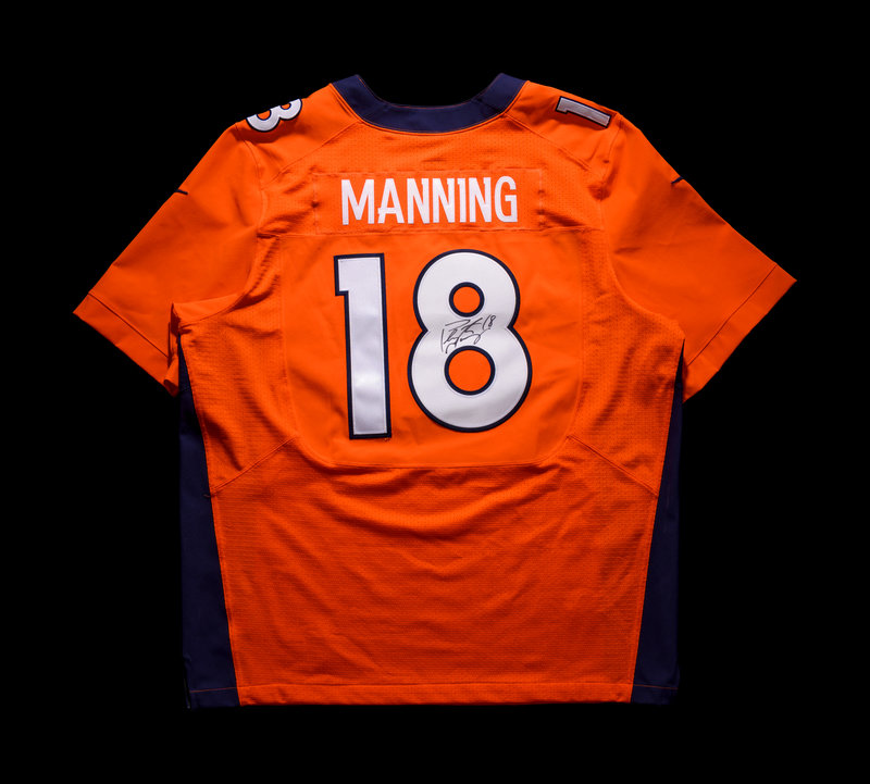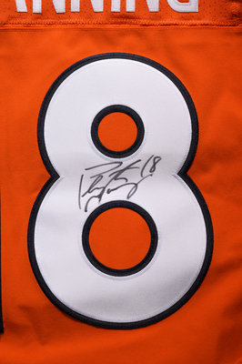 inscribed "Peyton Manning 18" in black Sharpie inside number 8 on back of jersey. Orange home jersey, size 52.