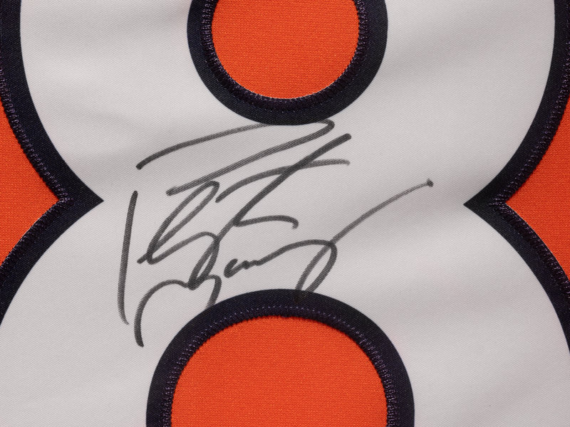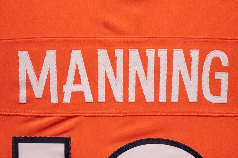 inscribed "Peyton Manning 18" in black Sharpie inside the 8 on back of Denver Broncos home orange jersey. Framed.