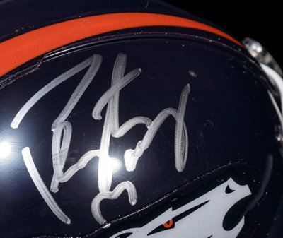 inscribed "Peyton Manning" in silver ink on right side above Broncos logo.