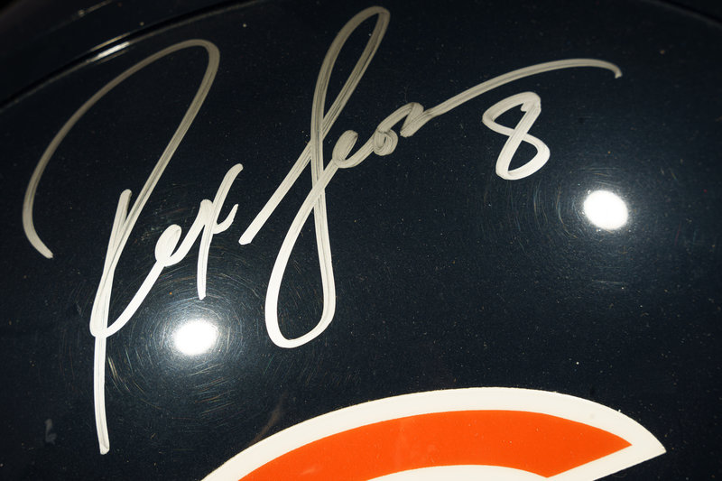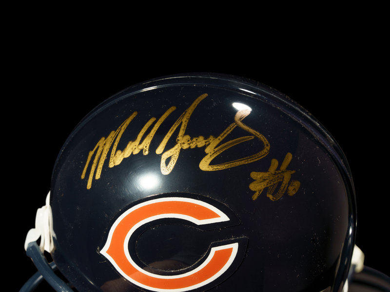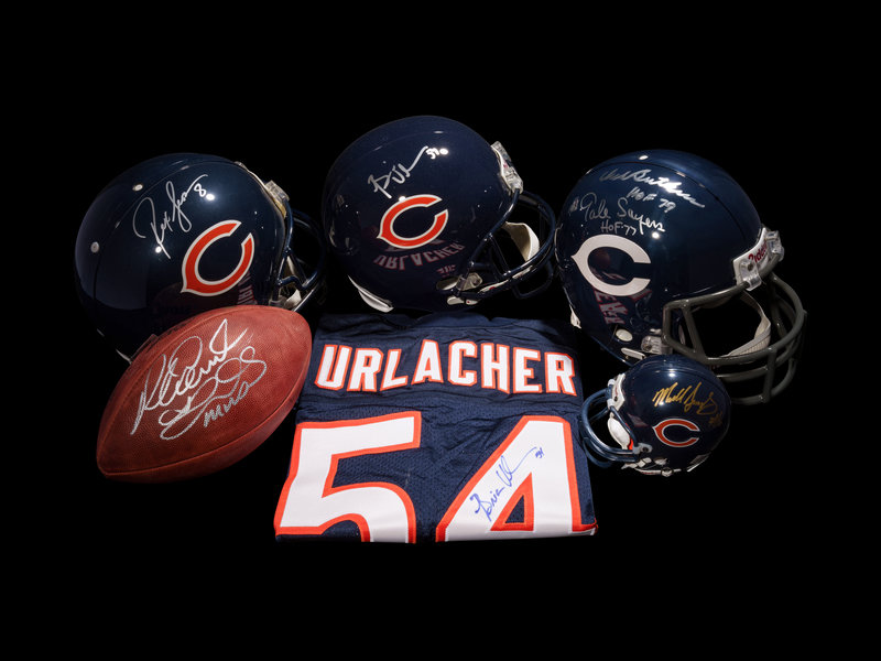 comprising of a full size Chicago Bears Riddell helmet inscribed "Dick Butkus" and "Gale Sayers" in silver ink, an official Super Bowl XX Wilson game football inscribed "Richard Dent MVP" in silver ink, a full size Chicago Bears Riddell helmet inscribed "Brian Urlacher 54" in silver ink, a Chicago Bears Reebok jersey inscribed "Brian Urlacher 54" in blue Sharpie, a Chicago Bears Riddell mini helmet inscribed "Michael Singletary #50" and and a full size Chicago Bears Riddell helmet inscribed "Rex Grossman 8" in silver ink.