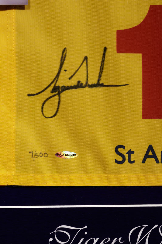 inscribed "Tiger Woods" in black Sharpie on flag left of 18. Numbered 7 of 500. Framed.