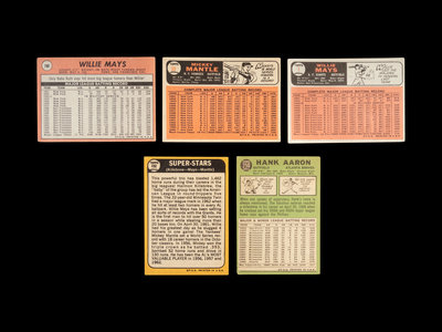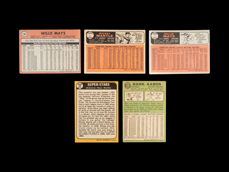 comprising of 1966 Mantle (50), Mays (1), 1967 Aaron (250), 1968 Super Stars Killebrew, Mays, Mantle (490) and 1969 Mays (190). Conditions average VG/EX. Acceptable for grading.