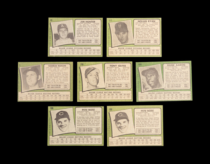 comprising of Nolan Ryan (513), Jim Catfish Hunter (45), Hank Aaron (400), Thurman Munson (5), Pete Rose (100) two cards and Tony Olivia (200). Cards average GOOD - VG/EX. Acceptable for grading.