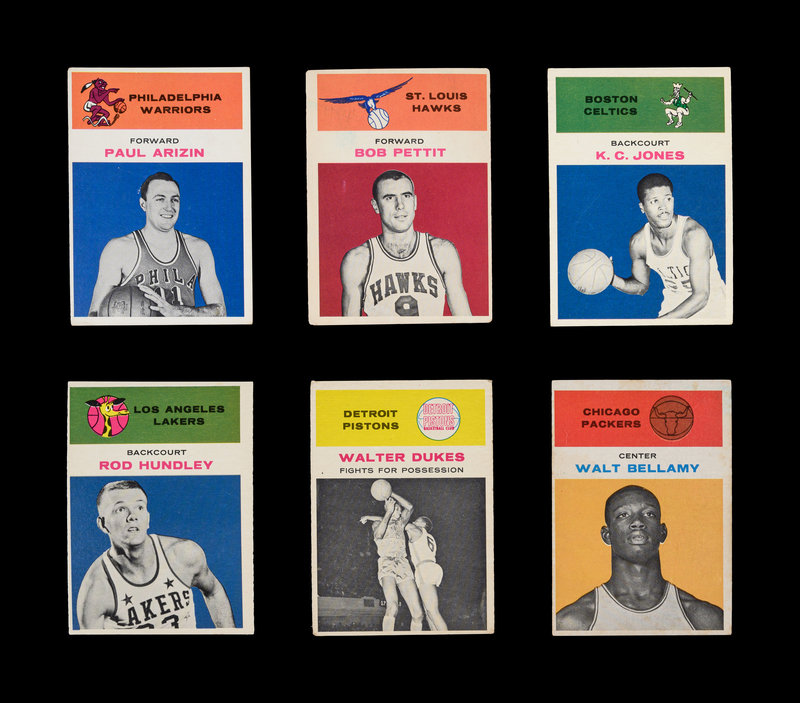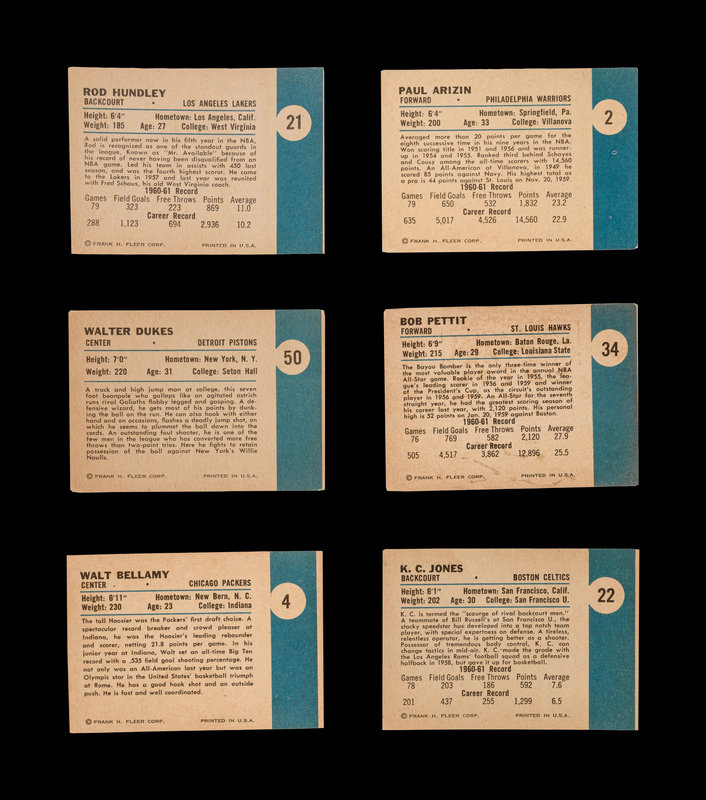 A Group of Six 1961 Fleer Basketball Cards including Walt Bellamy, K.C. Jones, Bob Pettit and Paul Arizin,